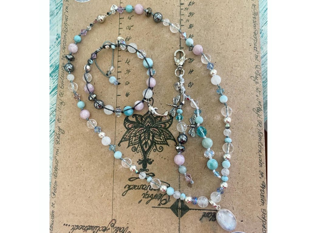 3) Tvoření - Podobu Vašeho náhrdelníku můžete ovlivnit nebo nemusíte, záleží na Vás. V zadání máte možnost si zvolit co chcete nebo naopak nechcete. Po jeho přečtení design "spatřím" - někde ve své představě a pak začnu navlékat a při tomto procesu se řídím intuicí. Kameny a komponenty, které vyberu přímo pro Vás (stříbro, komponenty Swarovski, popř. dřevo), navlékám na voskovanou nit (používám mnoho barev a každá má svůj význam). Náhrdelník je v průběhu času možné kdykoli převléknout.
